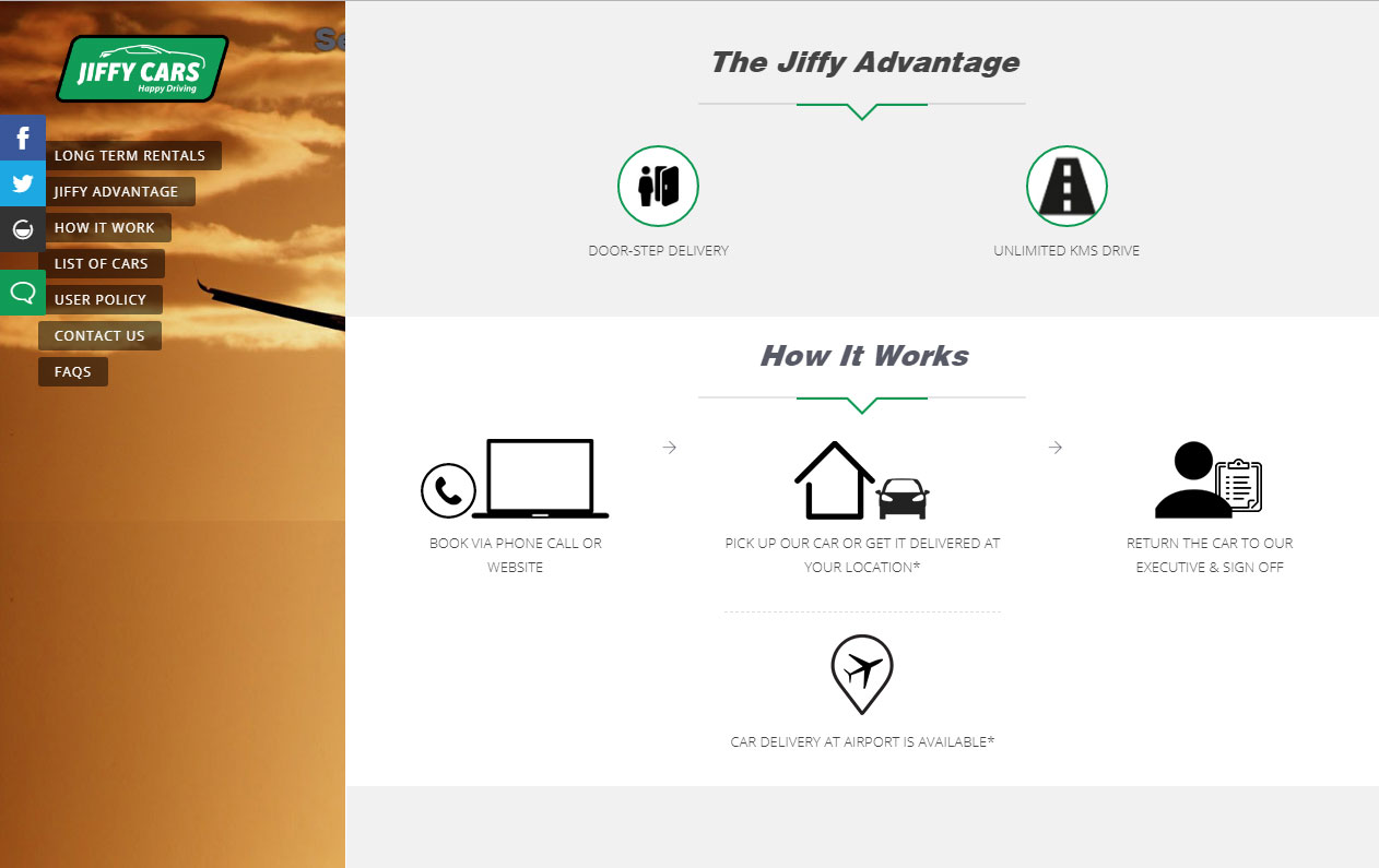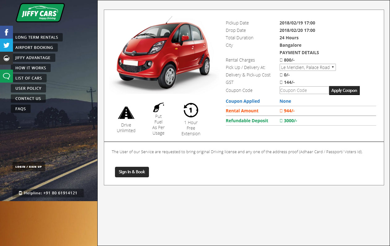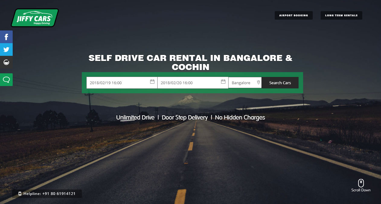 Jiffycars is a tech platform which enables people to book licensed cars for self drive from various parts of India including Bangalore, Cochin, Goa, Hyderabad, Chennai, etc. All cars listed in this platform have a Licensed Permit and come with comprehensive car insurance.